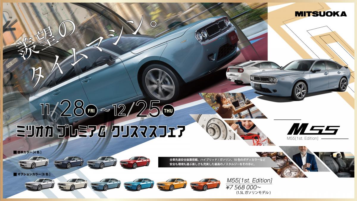 〖ミツオカプレミアムクリスマスフェア開催のお知らせ〗 この度、新型モデル「M55 1st Edition」の発売を記念し、全国のミツオカ取扱店にて『ミツオカプレミアムクリスマスフェア』を開催いたします。 期間中、対象車種をご商談いただいた各店ご商談先着10名様に、M55オリジナルハンドタオルをプレゼント。 開催期間 ・2025年11月28日(金)〜 12月25日(木) 対象拠点 ・ミツオカ取扱点全店(専売・直営・特約店) 対象車種 ・新車ラインナップ(バディは対象外)およびメイクアップ車 ご商談プレゼント ・M55オリジナルハンドタオル(各店先着10名様) また、11月28日正式発売に合わせて「M55 1st Edition」の展示も行っております。 実際に見て、触って、その魅力を直接ご体感いただけます。 スタッフ一同、皆様のご来店を心よりお待ちしております。 |